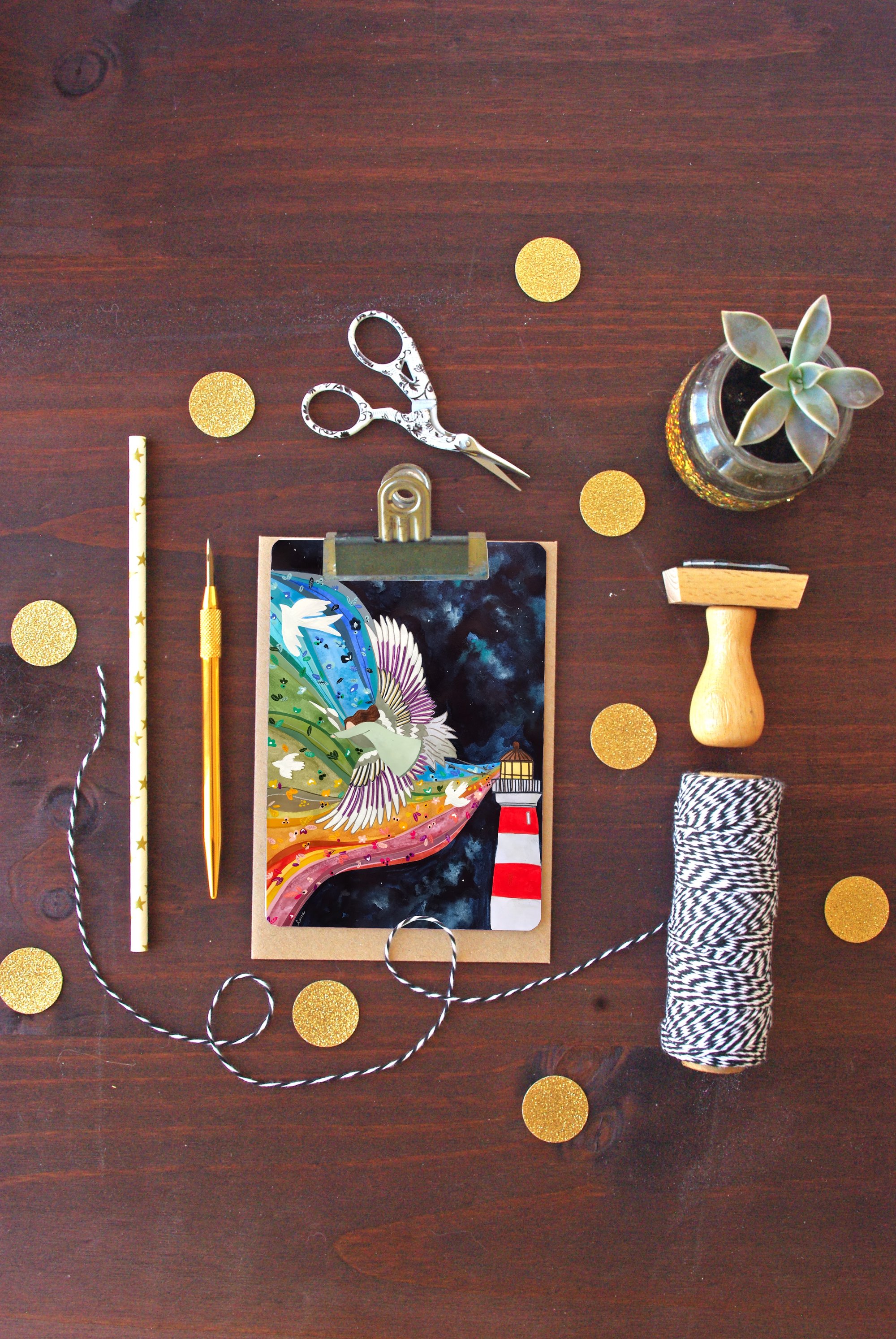 Carte postale de l’illustration Phare et pensées (Inktober 2025), imprim̩ée sur papier 300Gr, dimensions 10,5 x 14,8 cm (format classique A6), bords arrondis.