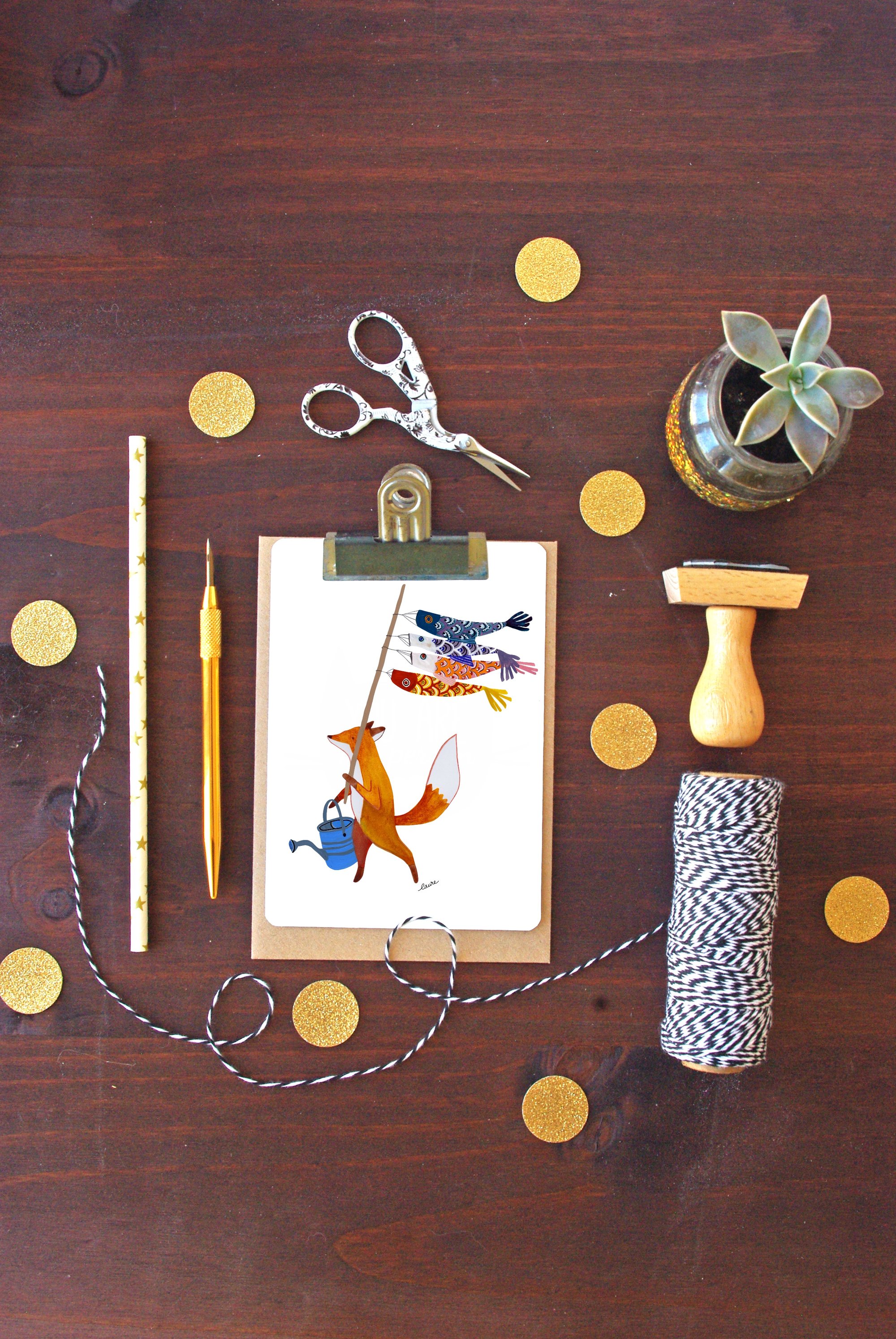 Carte postale de l’illustration Renard Koïnobori (Inktober 2025), imprim̩ée sur papier 300Gr, dimensions 10,5 x 14,8 cm (format classique A6), bords arrondis.