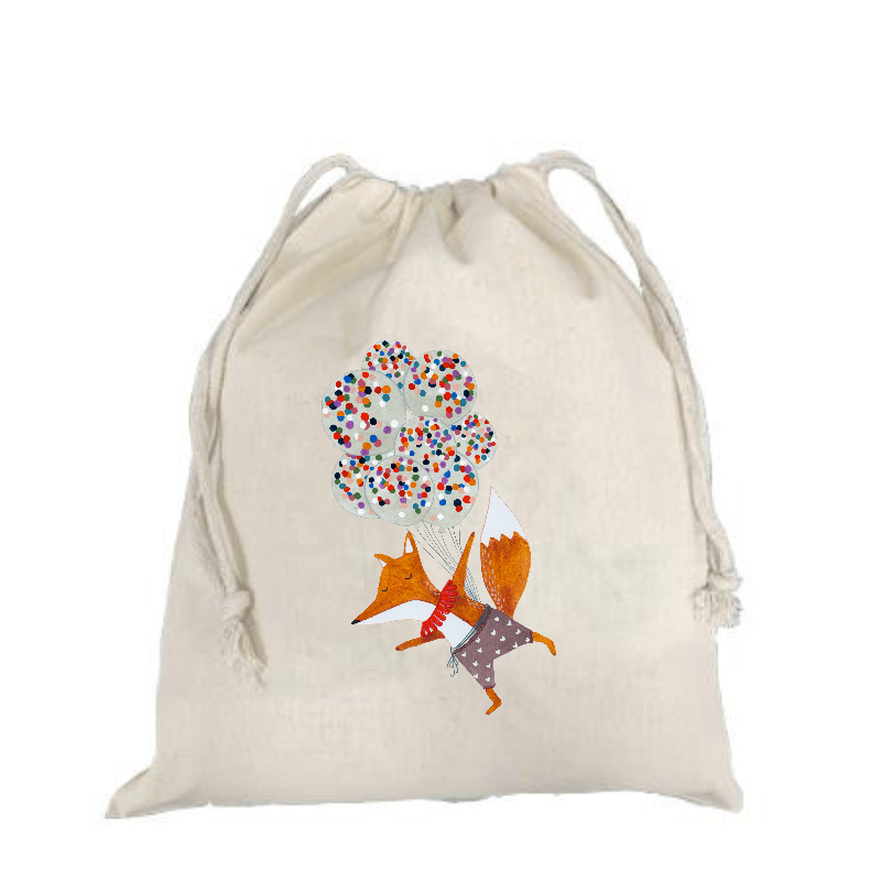 Petit pochon de coton (certifié Oekotex) avec un lien coulissant, motif Renard Ballons imprimé en France.